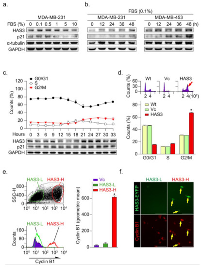 HAS3 overexpression arrested human breast cancer cells at the G2/M phase cell cycle. (a) MDA-MB-231 cells were treated with media containing serum at different concentrations (0–10%) for 24 h and harvested to detect the protein levels of HAS3, p21, α-tubulin, and GAPDH by Western blot analysis; (b) The protein levels of HAS3, p21, α-tubulin, and GAPDH were detected by Western blot analysis in breast cancer cells (MDA-MB-231 and MDA-MB-453), after being treated with 0.1% FBS for 12–48 h; (c) Flow cytometry analysis of MDA-MB-231 cells was performed, and the fraction of cells at G0/G1, S, and G2/M phase was assessed by PI staining (upper panel). The protein levels of HAS3, p21, and GAPDH were detected by Western blot analysis. The data are presented as the mean ± SD relative to the cell population (%); (d) HAS3 overexpression in MDA-MB-231 cells arrested cell proliferation at the G2/M phase of the cell cycle. Representative flow cytometry histograms showing alterations in the cell cycle of MDA-MB-231 cells 24 h after transfection. The data are presented as relative to the cell population (%). Data were analyzed with a paired t-test, and the presented p-values are two-sided. * p < 0.05 compared with the Wt group. (e) HAS3 overexpression was simultaneously detected in cyclin B1 protein-positive stained MDA-MB-231 cells. Flow cytometry dot plot analysis was performed in HAS3-EYFP-pcDNA3.1 plasmid- and EYFP-pcDNA3.1 plasmid-transfected cells (left, upper). The flow cytometry histograms show that cyclin B1 expression in MDA-MB-231 cells was detected by using a rhodamine-labeled antibody against cyclin B1 (left, lower). The results were quantified according to the geometric mean signal for rhodamine (cyclin B1) (right). The data are presented as the mean ± SD; * p = 0.00028 compared with the control group. HAS3-L, Has3 lower expression; HAS3-H, HAS3 higher expression; (f) We further detected cyclin B1 protein expression in the population of HAS3-H and HAS3-L cells by IF staining. The results indicated that cyclin B1 protein overexpression was detected preferentially in HAS3-H cells (yellow arrows). Magnification, 630×; scale bar, 200 μm.