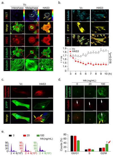 HAS3 overexpression promoted microtubule hyperacetylation through the direct binding of HAS3 to microtubules. (a) The interaction of β-tubulin with HAS3 in MDA-MB-231 cells was detected by FRET assay. HAS3/β-tubulin protein complex formation in cells was examined under a confocal microscope imaging system via FRET analysis. Magnification, 630×; scale bar, 7.5 μm; (b) Time-lapse measurement (FLIM assay) of the interaction of α-tubulin with HAS3 in MDA-MB-231 cells. FLIM occurred between the donor fluorophore (AmCyan) and acceptor fluorophore (EYFP) upon excitation of the donor fluorophore, only when the distance between fluorophores was less than 10 Å. Magnification, 630×; scale bar, 25 μm. The fluorescence lifetime decay kinetics for α-tubulin-AmCyan (FRET donor) in the presence of HAS3-EYFP-pcDNA3.1 or EYFP-pcDNA3.1 (FRET acceptor) were determined by FLIM microscopy. The mean lifetime of each emission band of AmCyan was collected every 30 min for 10 h, and the values were plotted along the wavelength (lower panel). The data are presented as the mean ± SD; * p = 0.018 compared with the control group; (c) To observe the hyperacetylation of microtubules, HAS3-EYFP-pcDNA3.1 and EYFP-pcDNA3.1 plasmid transfection in MDA-MB-231 cells was fixed and stained with anti-acetylated α-tubulin/AffiniPure goat anti-mouse-rhodamine; Magnification, 630×; scale bar, 10 μm. (d) HA-treated (0–100 ng/mL) MDA-MB-231 cells were fixed and stained with anti-acetylated α-tubulin/AffiniPure goat anti-mouse FITC and anti-γ-tubulin/AffiniPure goat anti-rabbit rhodamine. The protein expression of γ-tubulin in the cells is indicated by the white arrow, whereas the yellow arrow indicates acetylated α-tubulin. Magnification, 630×; scale bar, ten μm; (e) HA-induced G2/M cell cycle arrest in MDA-MB-231 cells. Flow cytometry was performed, and histograms show alterations in the cell cycle after 24 h of HA treatment detected by staining with PI (red arrow). Each phase of the cell cycle is presented relative to the total cell population. Data were analyzed with a paired t-test, and the presented p-values are two-sided. * p < 0.05 compared with the control group.