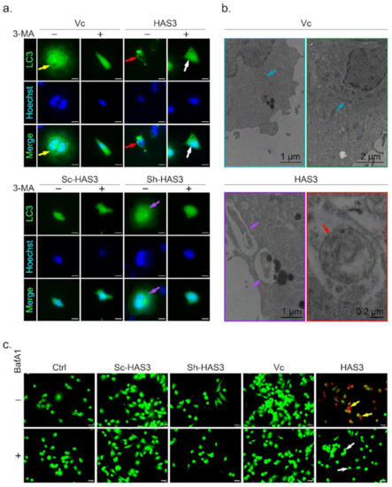 A previous study demonstrated that microtubule hyperacetylation promotes autophagy in human cancer cells [30]. We then test whether the HAS-mediated antitumor effects induced autophagic cell death is the primary mechanism. One of the essential characters for autophagic cell death is the formation of the autophagosome, a spherical structure with a double-layered membrane. The LC3 can be used as a marker to identify autophagosomes by immunocytochemical detection. In this study, MDA-MB-231 cells were transfected with the LC3-GFP plasmid to generate an in vitro cell research model (named LC3-GFP-MDA-MB-231) used to detect autophagosome formation [31] (Figure 5a, indicated by yellow arrow). The results showed that the LC3-labeled autophagosomes were increased in the HAS3 overexpression cells (Figure 5a, red arrow). The phenomenon was attenuated by treatment with 3-methyladenine (3-MA), an inhibitor to study the mechanism of autophagy (lysosomal self-degradation) and apoptosis under various conditions [32] (Figure 5a, white arrow). The HAS3 inhibition by shRNA attenuates the autophagosome formation compared to the scrambled sequence vector control group in the LC3-GFP-MDA-MB-231 cells (Figure 5a, purple arrow).