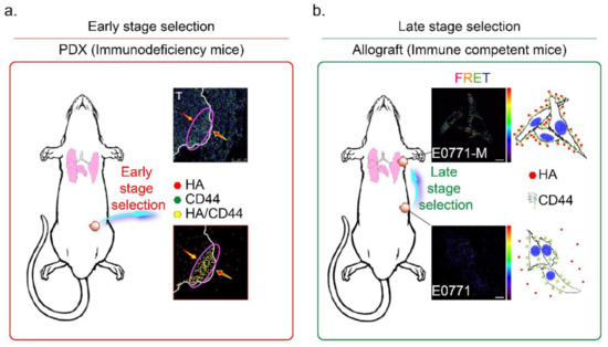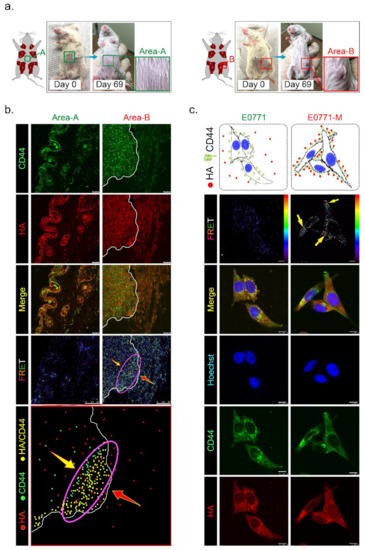 Previous studies demonstrated that CD44 is a receptor for HA expressed in highly metastatic tumor cells [20]. According to Figure 1c, we found that lung-metastatic breast cancer cells (E0771-M) were resistant to the migration inhibition effects of HA in the Transwell assay. We hypothesized that highly migratory cancer cells (such as E0771-M) with functional membranous CD44 are selected from the original tumor site to invade the HA-rich stromal area of tumor tissues. The CD44 interacted with HA in the tumor/normal junction of PDX tumor tissues was determined by FRET assay (Figure 6b). The tissues from area-A (stroma alone) and area-B (tumor/stroma junction) were dissected from the PDX tumor-bearing mice, and the tissue sections were stained with antibodies specific to CD44 (labeled with FITC) and HA (tagged with rhodamine). The results indicated that the highly migratory breast cancer cells invaded from the tumor center into the margin of stromal tissues (Figure 6b, yellow arrow). In contrast, HA was synthesized and released from normal stromal tissues into the extracellular space of tumor tissues (Figure 6b, red arrow). Highly migratory breast cancer cells with CD44 expression bound to HA released from stromal tissues were detected as FRET-positive stained cells, showing that they accumulated mainly near the margins of tumor tissue (Figure 6b, purple oval circle). These results suggest that HA does not directly inhibit highly malignant cell migration through a CD44-mediated mechanism.
