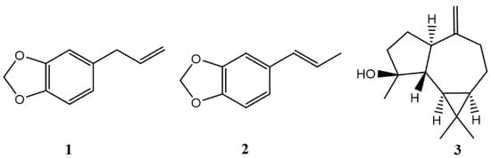 Sixteen components were identified in the leaf EO: 78.06% were phenylpropanoids, 3.08% terpenes and 0.37% benzaldehydes. Leaf EO was mainly characterized by safrole (1) (65.03%), isosafrole (2) (11.90%), and spathulenol (3) (11.16%) (see Figure 1).