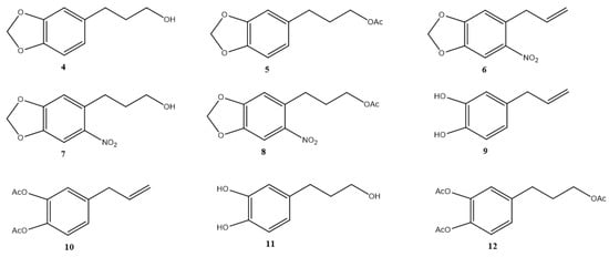 Safrole derivatives 4–12 were obtained in moderate to good yields (40.0–95.0%) (Figure 2). NMR data of 4–12 were consistent with what we had previously reported (see Supplementary Materials).