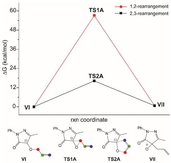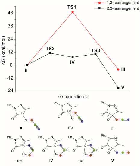 Then, in the formation of the 3-alkyl-4-hydroxy-1-aryl-4-(propa-1,2-dienyl)1H-pyrazol-5(4H)-ones 4a–d, the Wittig rearrangement observed is of the [2,3]-type, as the spectroscopic data of the products 4 clearly support (Scheme 2 and Scheme 3). To exclude that, in the concomitant formation of the 9-alkyl-7-aryl-1-oxa-7,8-diazaspiro[4.4]nona-3,8-dien-6-ones 5d–g, the [1,2]-Wittig rearrangement was involved by means of cyclization of intermediate III (Scheme 3), a DFT study has been carried out.