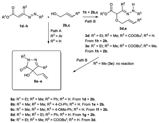 As supposed, both allyl (2b) and crotyl (2c) alcohol reacted with 1h, at room temperature, with only one equivalent of K2CO3, under solvent-free conditions, furnishing the hydrazonic adduct intermediates 3d,e (Scheme 4, Path B and Scheme 5, Table 3). Unfortunately, while compound 3d, if treated with 1 equiv. of K2CO3 in ethanol, was converted into the corresponding 4-allyl-4-hydroxy-3-alkyl-1-alcoxycarbonyl-1H-pyrazol-5(4H)-one 6e, 3e did not furnish the corresponding pyrazol-5(4H)-one under any of the countless conditions tested (Scheme 4, Path B and Scheme 5, Table 3. For the conditions tested, see Table S2 in the Supplementary Materials).