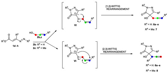 Also in this case, the reaction proceeds through the preliminary formation of a hydrazonic adduct intermediate 3, by means of the nucleophilic attack of the oxygen of allyl alcohol 2 to the terminal carbon atom of the azoene system of the DD 1, followed by a base-promoted cyclization due to a nucleophilic attack of the hydrazonic nitrogen at the ester group of hydrazone 3, with the loss of an alcohol molecule, to give the corresponding non-isolable pyrazolone VI (Scheme 5). Now, the base-promoted loss of the hydrogen in the 4 position of the pyrazolone ring can theoretically promote both [1,2]- and [2,3]-Wittig rearrangements, however, furnishing in both cases the same final products 6a–d (Scheme 4 and Scheme 5) [17,18].