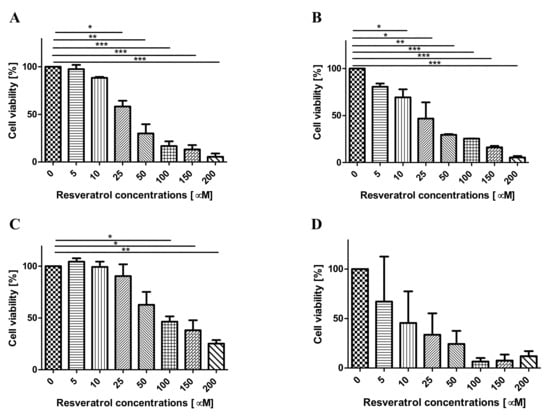 The effect of resveratrol on cell proliferation was investigated using the MTT colorimetric assay [44]. The cells of the tested lines were plated in 96-well plates 24 h before the start of the experiment in the following amounts: EPP85-181P and AsPC-1 cells—5 × 103 cells/well, EPP85-181RNOV cells—2.5 × 103 cells/well and H6c7 cells—1.2 × 104 cells/well. Dimethyl sulfoxide (DMSO) was used as an initial solvent. Resveratrol was subsequently dissolved in culture media for cell treatment. The cells were then treated with a solution of resveratrol at various concentrations (0, 5, 10, 25, 50, 100, 150 and 200 µM) at three-time regimens: 24, 48 and 72 h (37 °C, 5% CO2). After incubation under the set conditions, cells were treated with a solution of MTT (3-(4,5-dimethylthiazol-2-yl)-2,5-diphenyltetrazolium bromide) (0.5 mg/mL) for 4 h (37 °C, 5% CO2). The MTT cytotoxicity test is based on the color reaction of a tetrazole salt and the assessment of the mitochondrial activity of the cells. As a result of the reduction of the substrate in the mitochondria of living cells, a water-insoluble purple formazan compound is formed depending on the viability of the cells. After the formazan crystals were thoroughly dissolved in dimethylsulfoxide (DMSO), the absorbance was measured for each sample at 570 nm using a microplate reader (Infinite 200 Pro, TECAN, Männedorf, Switzerland). The experiment was repeated independently three times.