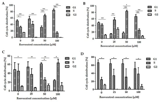 The cell cycle is a basic process common to all living organisms, essential for repro-duction and growth. It comprises two main phases: the interphase (G1, S and G2 phases) and mitosis (M) [32]. It was found that resveratrol influences the cell cycle by reducing the number of cells in the G1/S and S/G2 phases, which leads to the inhibition of cell proliferation [33,34]. The analysis of the cell cycle in the tumor lines EPP85-181P and EPP85-181RNOV showed that lower concentrations of resveratrol (25 and 50 µM) increase the number of cells in the S/G2 phase. In the mitoxantrone-resistant line, this effect was stronger. On the other hand, at a higher concentration (100 µM), a greater accumulation of cells in the G1/S phase was observed. These results are consistent with previous studies performed on the EPP85-181P and EPP85-181RNOV cell lines, treated for 72 h with two concentrations of resveratrol (30 and 50 µM) [25]. In the EPP85-181P and EPP85-181RNOV lines, at a concentration of 50 µM, an increase in the number of cells in the S/G2 phase was observed, while in the EPP85-181RNOV line, these changes were visible at a lower concentration (30 µM) [25]. In our study, no significant changes in the distribution of the different phases of the cell cycle were observed in the AsPC-1 line after 48 h of incubation with resveratrol (0–100 µM). In contrast, the team of Cui et al. showed an increase in cell accumulation in the S phase of the cell cycle. However, these changes were observed after 72 h of incubation with resveratrol at a concentration of 100 µM [3].