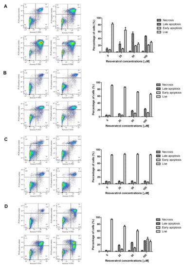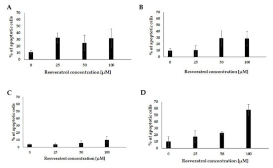 The flow cytometry method was used to study the intensity of the apoptotic induction under the effect of resveratrol. The cells of the tested lines (EPP85-181P, EPP85-181RNOV, AsPC-1 and H6c7) were cultured in 25 cm2 flasks for 24 h (37 °C, 5% CO2). After this time, cells were treated with resveratrol at concentrations of 0, 25, 50 and 100 µM for 48 h (37 °C, 5% CO2). Subsequently, they were trypsinized and then centrifuged (1050 rpm, 5 min) in fresh culture medium. Cells were then rinsed twice in PBS solution and centrifuged afterwards (1050 rpm, 5 min). Cells were diluted to 1 × 106 cells/mL and stained with the FITC Annexin V Apoptosis Detection Kit II (Beckton Dickinson, Franklin Lakes, NJ, USA) according to the manufacturer’s instructions. Data from at least 10,000 events were collected for each sample. The results obtained were further analyzed with the FlowJo 10.5 software (FlowJo, Asham, OR, USA). The experiment was carried out in three independent laboratory replications.
