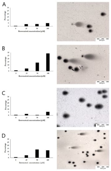 Percentage of nuclei with DNA damage in pancreatic cell lines after 48 h of incubation with different concentrations of resveratrol: (A) EPP85-181P cell line, (B) EPP85-181RNOV cell line, (C) AsPC-1 cell line and (D) H6c7 cell line.