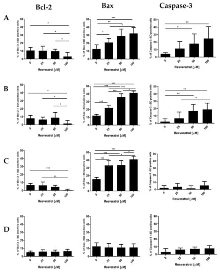 Analysis of resveratrol’s ability to induce apoptosis in human pancreatic cells by immunocytochemistry. In the tested cell lines, the effect of resveratrol on the expression level of the Bcl-2, Bax and Caspase-3 proteins (related to the apoptotic process) was assessed. The cells of each cell line were exposed to 48 h of treatment with various concentrations of resveratrol. (A) EPP85-181P cell line, (B) EPP85-181RNOV cell line, (C) AsPC-1 cell line, (D) H6c7 cell line; * p < 0.01; ** p < 0.001; *** p < 0.0001.