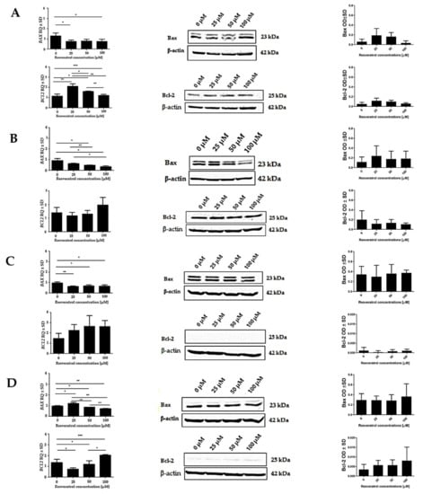 To better understand the effect of resveratrol on the inhibition of cell growth and the induction of the apoptotic process, Western Blot analyses were performed. Proteins from the Bcl-2 family play a key role in the control of the apoptotic execution process. Among the members of this family, there are pro-apoptotic proteins (e.g., Bid, Bax) and proteins that inhibit this process (e.g., Bcl-2). Thanks to these two opposite types of regulatory proteins, it is possible to maintain the homeostasis of the processes of this type of programmed cell death [38,39].