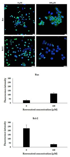 For immunofluorescence, AsPC-1 cells were plated (1.5 × 104 cells/well) on Millicell® EZ SLIDES eight-well glass slides (Merck Millipore, Gernsheim, Germany). After 24 h, cells were treated with resveratrol (0 and 100 µM) for 48 h. Cells were then fixed in 4% paraformaldehyde (12 min, room temperature). The membranes were permeabilized with 0.2% Triton X-100 (10 min, room temperature). Nonspecific binding sites were blocked with 3% BSA in PBS (1 h, room temperature). Cells were incubated overnight at 4 °C with primary antibodies: Bax (1:25 dilution, Santa Cruz Biotechnology, Dallas, TX, USA) in 3% BSA/PBS and Bcl-2 (ready-to-use, Dako, Glostrup, Denmark). Protein detection was performed with Alexa Fluor 488 conjugated antibody secondary antimouse (dilution 1:2000, Abcam, Cambridge, UK, Cat# ab150113, RRID: AB_2756499), incubation 1 h, temp. 4 °C. The slides were sealed in a medium containing DAPI (Invitrogen, Carlsbad, CA, USA). The analysis of the proteins levels was performed using a Fluoview FV3000 confocal microscope (Olympus, Tokyo, Japan, RRID: SCR_017015) with the cellSens software (Olympus, Tokyo, Japan, RRID: SCR_016238).