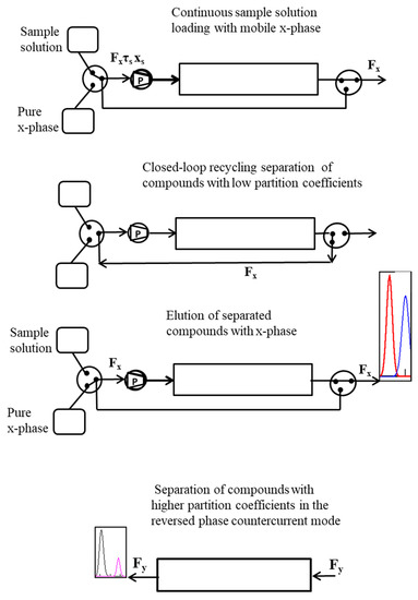 A number of preparative methods for high-performance liquid–liquid partition chromatography, commonly known as counter-current chromatography (CCC), are widely used from laboratory to industrial scales due to the high adaptability of these methods to different separation tasks [1,2,3,4,5,6,7,8,9,10,11,12,13,14,15,16,17,18,19,20,21,22,23,24,25,26,27,28,29,30,31,32,33,34]. Recently in [6,7], a new two-stage CCC separation method called closed-loop recycling dual-mode counter-current chromatography (CLR DM CCC) was developed, which is a combination of two well-known methods—closed-loop recycling (CLR) and dual-mode (DM) counter-current chromatography. In the first stage, in the closed-loop recycling mode, the mixture compounds with low partition coefficients are separated and eluted with the mobile x-phase through one end of a column. In the second stage, the compounds with higher partition coefficients are separated in the inverted-phase counter-current mode and eluted with the mobile y-phase through the opposite end of the column.