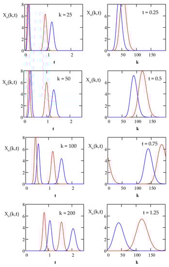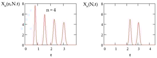 where X(n,k,t) and X(n,N,t) describe the variations in the normalized concentration of the compound with an equilibrium distribution ratio of KD = y/x in the column and at the outlet of the column during the recycling process in any individual cycle n, disregarding the interactions of the concentration profiles from the previous cycles. The interactions of neighboring concentration profiles are accounted for in Xn(k,t) and Xn(N,t). Equations (3) and (4) describe the variations in the compound KD-normalized concentration in the k-cell and at the outlet of the column (k = N) during the recycling process. Equation (3) describes the distribution of the compound KD-normalized concentration along the column at time t.