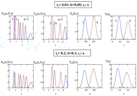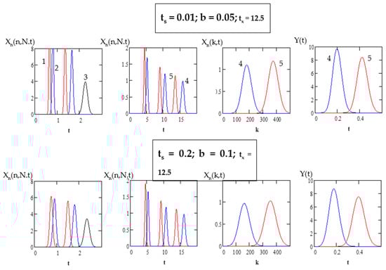 Figure 4 shows two versions of the separation process for the mixture containing four compounds (KD1 = 0.4, KD2 = 0.7, KD3 = 6, KD4 = 8) on the closed-loop setup with N = 300, Nec = 200, Sf = 0.5 and short (b = 0.05) and long (b = 0.1) recycling lines under two different sample loading conditions: ts = 0.01 and ts = 0.2. In the first stage, after three passages through the column, the compounds with low partition coefficients (1 and 2) are separated via the mobile x-phase, while in the second stage, the compounds with higher partition coefficients (3 and 4) are separated in the inverted-phase counter-current mode with the mobile y-phase. The separation of the compounds in closed-loop recycling is simulated by Equation (19). After the third cycle of recycling of compounds 1 and 2 at t = 2 and t = 2.2, the loop is opened and the separated fractions of compounds 1 and 2 are eluted with the x-phase. After the elution of these compounds at t = 3 and t = 3.1, the loop is closed again and compounds 3 and 4 continue to be recycled until t = tx = 6. The concentrations of compounds 3 and 4 in the column are simulated using Equation (18), putting t = tx = 6. Then, the loop is opened and the second separation stage for compounds 3 and 4 in the inverted-phase counter-current mode with the mobile y-phase starts. The elution profiles of these compounds are simulated by Equation (22).