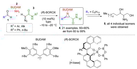 This type of MCR was found extremely useful for the preparation of 3-7 membered heterocycles. For the synthesis of aziridines, a series of Aza-Darzen reaction-based methodologies have been developed. For example, aziridine-3-carboxamides 4 were prepared using BOROX-type catalyst (chiral boronic ester) from a series of aldehydes 1, BUDAM-amine 2 (BUDAM: 3,5-di-tert-butyldianisylmethyl), and diazo acetamides 3 (Scheme 1) [13]. To achieve full stereoselectivity, a bulky substituent (BUDAM) was introduced into the amine component. Aziridine assembly was carried out at low temperatures and did not require pre-reacting the catalyst, the aldehyde, and the amine, so the diazo compound could be added directly into the reaction mixture. The reaction showed remarkable tolerance to functional groups in the aldehyde component (e.g., isocyanide, oxirane, alkyne, NHPG were tolerated). Obtained products were smoothly deprotected with TfOH to deliver NH-aziridines. This methodology was applied in the total synthesis of all four stereoisomers of naturally occurring aminodiol sphinganine 5.