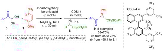 An important extension to this methodology by introduction of fluorinated substituents to aziridines was reported in 2020 by J.-A. Ma and co-authors. Fluorinated diazo reagent 8, was reacted with imines generated from p-anisidine 6 and aroyl heminal diols 7 to give aziridines 9 with fluorinated side chain (Scheme 2) [14]. Combination of a strong Brønsted acid (disulfonimide with axial chirality CDSI-4) and boronic acid was used to achieve diastereo- and enantioselectivity but with corresponding excess values were only moderate (up to 73%ee). Noteworthy, both protocols employ organocatalysis.