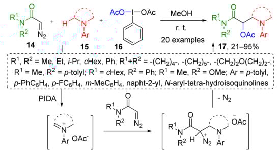 Several catalyst-free methodologies involving iminium species have also been developed, which is much less common. In the first one, diazo acetamides 14 were involved in a reaction with iminium acetate which was generated by oxidation of N-substituted anilines 15 by PIDA 16 (phenyliododiacetate), a hypervalent iodine compound (Scheme 4) [16]. This approach has another remarkable feature—iminium generation by oxidation instead of much more common condensations. The developed protocol delivered both cyclic and acyclic products 17 (derivatives of α-acetoxy-β-aminopropionic acid) depending on substation pattern in aniline. Interestingly, the third component contributing to the structure of product—acetoxy group comes from the same reagent (PIDA), therefore it has a double function.