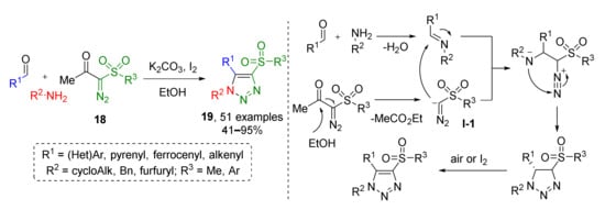 Another metal-free protocol was developed for the preparation of trisubstituted 1,2,3-triazoles 19 from imines and diazo ketosulfones 18 (Scheme 5) [17]. Initially generated triazolines were oxidized by iodine in a one-pot fashion. At first, diazo ketosulfones were deacylated under basic conditions to form terminal diazo sulfones in situ which, in turn, attack imines with nucleophilic carbon atoms to give intermediate diazo compound I-1. The latter undergoes addition of the former imine nitrogen atom at the diazo group which results in the formation of the triazoline cycle. The reaction was found to be very general and high-yielding except for when aliphatic substituents at the sulfur atom are used.