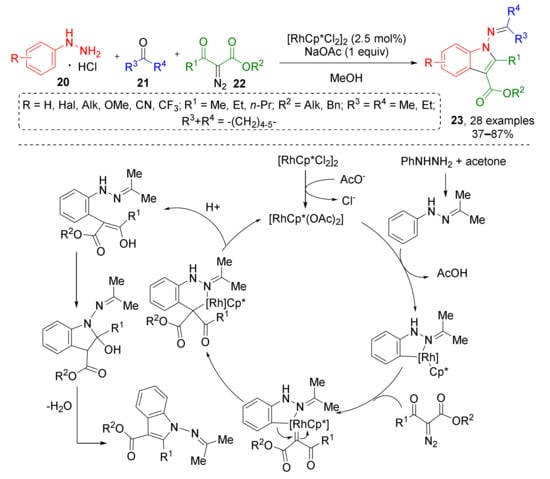An interesting example of Rh-catalyzed indole synthesis was reported by X. Cui in 2017 (Scheme 6) [18]. Aryl hydrazines 20 reacted with ketones 21 and diazo ketoesters 22 to provide rare N-iminoindoles 23. Reaction pathway included formation of imine, followed by CH-activation and cyclometallation, generation of Rh-carbenoid after addition of diazo compound with subsequent aryl migration, protonolysis, and intramolecular condensation.