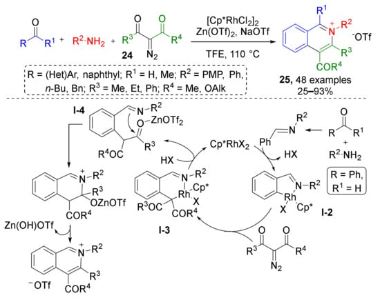 Based on similar methodology, a novel azine synthesis has also been developed. In 2018, X. Li et al. showed that synthetically challenging tetrasubstituted isoquinolinium salts 25 can be prepared from diazo ketoesters 24 and imines generated in situ under mixed Rh(III)/Zn(II) catalysis (Scheme 7) [19]. This reaction mechanistically resembles the previous case—it begins with CH-insertion of Rh in ortho-position of imine arylidene group (intermediate I-2) followed by addition of diazo compound and formation of Rh-carbenoid. Migratory insertion of the Rh-aryl bond to the carbene then delivers a Rh(III) alkyl intermediate I-3, which releases Rh after protonation giving intermediate I-4. Its keto group is then activated with Lewis acid (Zn(OTf)2, taken in equimolar amount) for nucleophilic attack with imine nitrogen. This cyclization is the final step on the way to isoquinolinium salts 25. The reaction mechanism was thoroughly investigated and supported by X-ray studies (rhodacyclic intermediate I-2 was isolated).