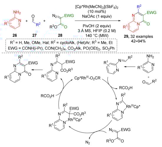 Another type of Rh-mediated CH activation was employed to build an azine-fused heterocyclic system. Reaction of 2-aminopyridines 26, aldehydes 27, and α-acyl diazo esters 28 provided a series of pyrido[1,2-a]pyrimidin-4-ones 29 (Scheme 8) [20]. This transformation also included a cyclometallation step but another type of CH-bond was activated—in imine moiety, not aryl. Reaction was carried out at high temperature (140 °C) under MW irradiation. A broad spectrum of diazo compounds was successfully used—diakyl diazo malonates, carbamoyl-, sulfonyl-, and phosphoryl diazo esters. The nature of substituents in two other components—aldehydes and amines showed no significant impact to the reaction outcome making this protocol very general.