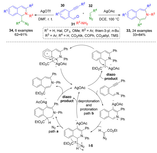 In 2015 L. Zhou and co-authors reported a novel approach towards seven-membered heterocycles using diazo-imine MCR. Furthermore, 3-Benzazepines 33 were obtained via a complex cascade of transformations: at first iminium substrate (N-alkylisoquinolinium) was generated from 2-formylphenylacetylenes 30 and anilines 31 via condensation and silver-catalyzed (AgOAc) imine−yne cyclization, which is a rare type (Scheme 9) [21]. According to one of the two mechanisms proposed by authors, this reaction was followed by addition of iminium to diazo compound 32 (terminal diazo esters or TMS-diazomethane), formation of dihydroisoquinolinic diazo intermediate I-5 and 1,2-aryl migration with ring expansion and nitrogen extrusion. Noteworthy, catalyst screening revealed that another silver source (AgOTf) can interrupt the last two steps, thus intermediate dihydroisoquinoline-derived diazo compounds 34 can be isolated.