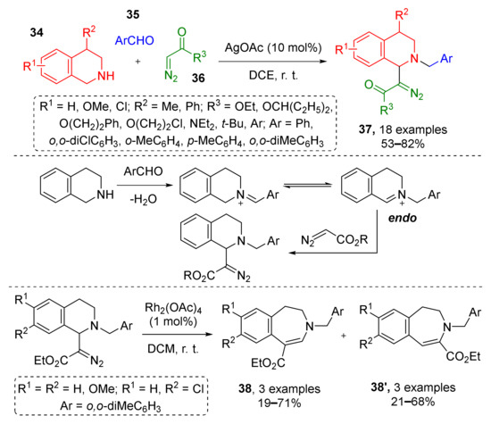 The same group later described a similar three-component protocol where iminium was generated via condensation of NH-tetrahydroisoquinoline 34 and aromatic aldehydes 35 followed by silver-catalyzed (AgOAc) nucleophilic addition of terminal diazo esters or amides 36 (Scheme 10) [22]. Obtained tetrahydroisoquinolinic diazo compounds 37 were isolated and applied in rhodium-catalyzed synthesis of dihydrobenzazepines 38 and 38′. The latter were formed as isomeric mixtures due to the following two types of transformations of the Rh-carbenoid—classic 1,2-aryl- or unexpected 1,2-N migration.