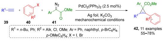In this subsection we will discuss MCRs where a substrate with unsaturated C-C bond is generated in situ to react with diazo compound via cycloaddition reaction. In 2018, J. Mack et al. reported a three-component protocol, which combined preparation of internal acetylenes via Sonogashira reaction of terminal acetylenes 39 and aryl halides 40 followed by cyclopropenation with diazo esters 41 (including terminal ones) under dual Pd/Ag or Pd/Cu catalysis and solvent-free conditions—ball milling (Scheme 11) [23]. Using this methodology, a series of tetrasubstituted cyclopropenes 42 was prepared in high yields. Both aliphatic and aromatic terminal acetylenes were involved successfully.