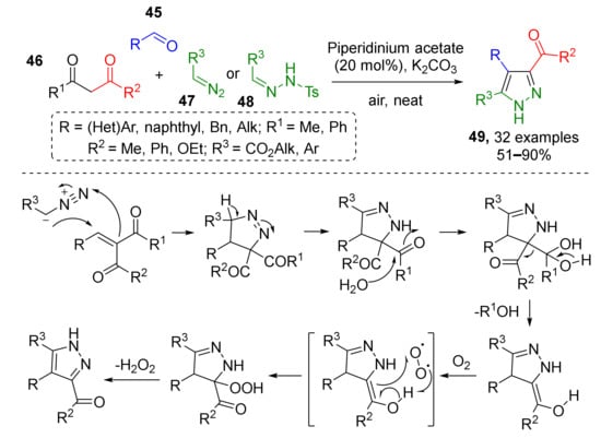 In situ generation of alkenes and subsequent 1,3-dipolar cycloaddition was shown to be an efficient strategy for the preparation of pyrazoles. In one such protocol, reported by S. A. Maurya et al., alkenes were generated in situ via the Knoevenagel condensation of aldehydes 45 and 1,3-dicarbonyl compounds 46 (Scheme 13) [24]. Olefins then reacted with terminal diazo compounds 47 or their precursors, N-tosylhydrazones 48, to provide 3,4,5-trisubstituted pyrazoles 49. Reaction intermediates, pyrazolines, were aromatized by air-mediated oxidative elimination of acetyl group.