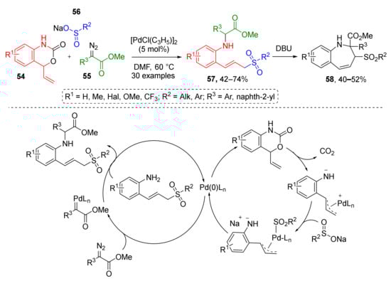 The first type was employed by W. Yang and co-authors in 2018 for Pd-catalyzed preparation of N-2-(3-sulfonylallyl)aryl substituted amino acid derivatives 57 from vinyl benzoxazinones 54, diazo esters 55, and aryl or alkylsulfinates 56 (Scheme 15) [26]. Benzoxazinones gave rise to 2-allylanilines via CO2 extrusion, followed by addition of sulfonate to form 2-(3-sulfonyl-prop-1-en-1yl)anilines which reacted with diazo compounds via NH-insertion. These products were further employed in the preparation of dihydro-1H-benzo[b]azepines 58 via base-promoted dehydrogenative cyclization.