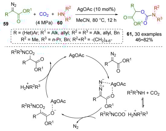 A carbamate-based MCR was reported in 2018 by H. Jiang and co-authors who showed that silver-catalyzed reaction of N,N-dialkylcarbamates 59 and α-diazoesters 60 opens facile access to α-carbamoyloxy esters 61 (Scheme 16) [27]. Carbamates were generated in situ from both cyclic and acyclic amines and CO2 gas (4 MPa) in a steel autoclave. The final reaction step was denitrogenative addition of O-nucleophilic center of carbamate to carbon atom of diazo group.