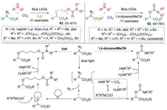 The same group recently reported a substantial improvement of this methodology—a catalyst-free visible light-driven protocol for the preparation of compounds 62 (Scheme 17) [28]. One of its important advantages is the use of CO2 at atmospheric pressure. Interestingly, when THF was used as solvent, a four-component coupling reaction occurred giving product with additional 1-butoxy linker between carbamoyl and arylacetate moieties giving products 63. In this case, THF presumably reacted with carbene generated photolytically from diazo compound giving oxonium ylide, which further underwent a nucleophilic attack by the carbamate anion.