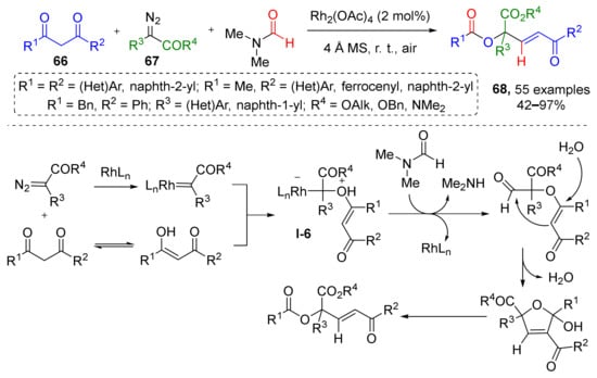 Reactions where diazo compounds react with alcohols or ethers to form oxonium ylides via formal nucleophilic substitution of diazo group are one of the most common. Recently, this methodology was extended by three-component reaction of 1,3-diones 66, diazo esters 67, and N,N-dimethylformamide (DMF), leading to an unusual formal insertion of O–C(sp3)–C(sp2) into unstrained C(CO)−C bonds and preparation of compounds 68 (Scheme 19) [30]. The reaction was conducted in DMF in the presence of rhodium tetraacetate and molecular sieves at room temperature. This protocol was applied to obtain a large series (50+ compounds) of previously inaccessible α,α,α-trisubstituted esters or amides. The key step of this transformation was Rh-catalyzed formation of oxonium ylide I-6 from enol tautomer of diketone and diazo compound. Mechanistic study involving isotopic labeling showed that O, C(sp3), and C(sp2) units of the product originate from 1,3-diones, diazo esters, and DMF, respectively.