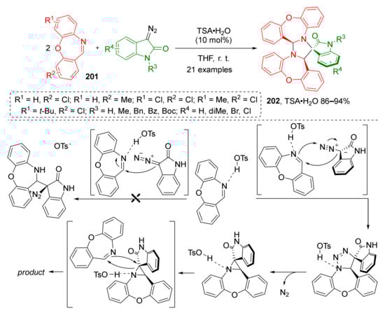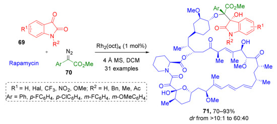 This type of reaction has also been used in the synthesis of complex biologically active compounds. For example, in 2019, natural immunosuppressant rapamycin was regio- and diastereoselectively modified using substituted isatins 69 and α-aryl-α-diazoacetates 70 to produce a series of forty novel indoline-substituted analogs 71 (Scheme 20) [31]. The obtained compounds were tested against several cancer cell lines and were found to be promising anticancer drug leads.