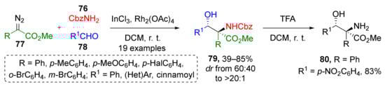 The same group previously reported another interesting MCR where ammonium ylides were generated from carbamate (Fmoc, Boc or CBz-NH2 (76)) and diazo esters 77 (Scheme 22) [33]. (Hetero)aromatic aldehydes 78 were used as the third component to provide β-hydroxy-α-amino acid derivatives 79 under dual Rh/In-catalysis. All products were isolated in high yields as single diastereomers under mild reaction conditions (DCM, room temperature). For one of the products, the possibility of N-deprotection was confirmed—Cbz group was smoothly removed by TFA to give compound 80.