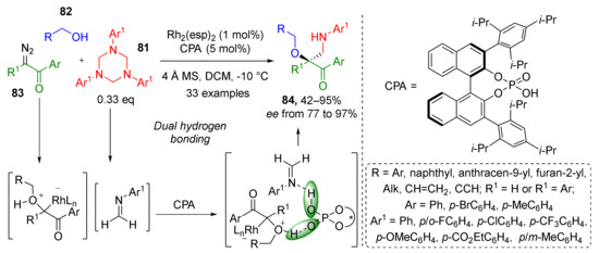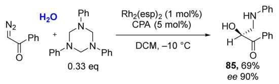 In 2020, 1,3,5-triazinanes 81 were employed by W. Hu et al. as stable trimeric form of formaldehyde imines, which reacted with alcohols 82 and diazo acetophenones 83 to provide a series of substituted α-hydroxy-β-aminoacetophenones 84 (Scheme 23) [34]. A combination of rhodium espinoate and binaphthyl-based chiral phosphoric acid afforded target compounds not only in high yields and mild conditions but also with high enantioselectivity. The key reaction step was Rh-mediated formation of oxonium ylide from alcohol and diazo reagent.