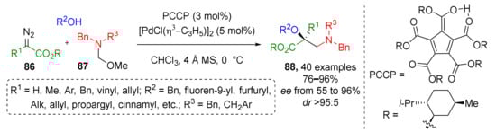 One year earlier, the same group showed that structurally related N,N-disubstituted α-hydroxy-β-aminocarboxylic acids 88 can be also prepared following this strategy (Scheme 25) [35]. The main difference was using α-aminomethyl ether 86 as the methylene iminium ion precursor and diazo esters 87 (not ketones) as the second component. High enantioselectivity in this case required a complex recently (2016) developed ligand—chiral menthol ester of pentacarboxycyclopentadiene (PCCP) acid. Notably, in this work a series of quantum chemical calculations was performed to rationalize the reaction mechanism, choice of chiral ligand, and stereoselectivity.