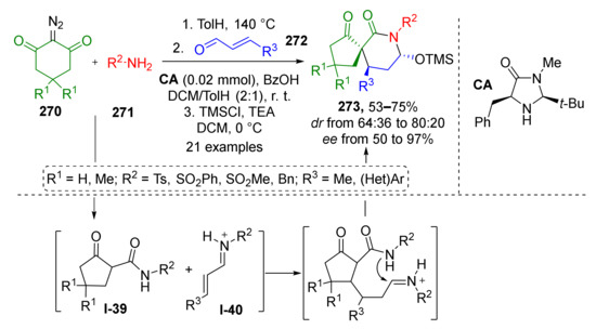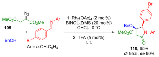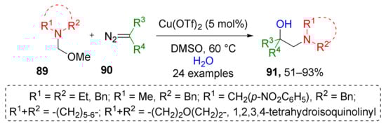 While in the above mentioned approach only one iminium precursor was used (N,N-dibenzyl), J. Sun et al. reported a copper-catalyzed protocol which expands it by variation of substituents at nitrogen atom in compounds 89 (Scheme 26) [36]. Specifically, different types of cyclic moieties, such as piperidine, morpholine, and dihydroisoquinoline were introduced to product molecules 91 in such a way. Notably, in this case, water was used instead of benzylic alcohol giving direct access to O-unprotected products. Additionally, a broader spectrum of diazo compounds 90, namely, esters, lactones, amides, and ketones were found to be suitable for this reaction.