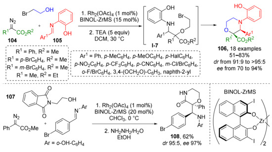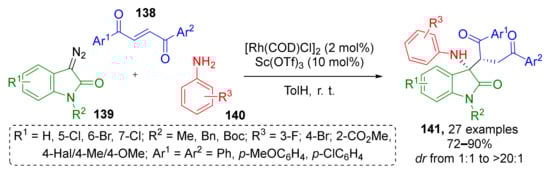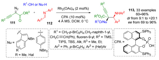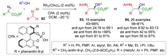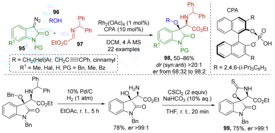 Heterocyclic moieties can be also introduced to this type of MCR. One such example published in 2017 implemented N-substituted 3-diazoindoline-2-ones 95 (Scheme 28) [38] for the preparation of α-amino-β-hydroxy esters 98. The other two reaction components were alcohols 96 and imines 97 prepared from ethyl glyoxylate. The scope of the alcohol component was limited to benzylic ones only. Catalytic system consisted of rhodium tetraacetate and the same type of chiral additive—BINOL-derived phosphoric acid (CPA). The authors also demonstrated the application of this methodology to synthesis of spiroheterocyclic compounds 99 via a two-step procedure.