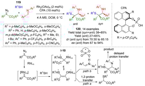 - Xiao, G.; Ma, C.; Xing, D.; Hu, W. Enantioselective Synthesis of alpha-Mercapto-beta-amino Esters via Rh(II)/Chiral Phosphoric Acid-Cocatalyzed Three-Component Reaction of Diazo Compounds, Thiols, and Imines. Org. Lett. 2016, 18, 6086–6089. [Google Scholar] [CrossRef]