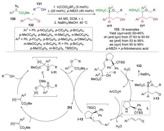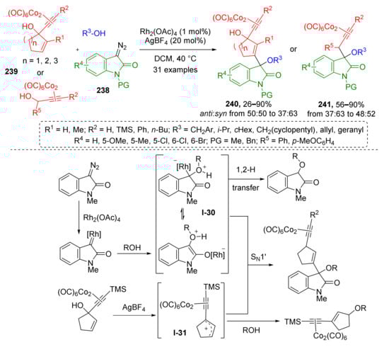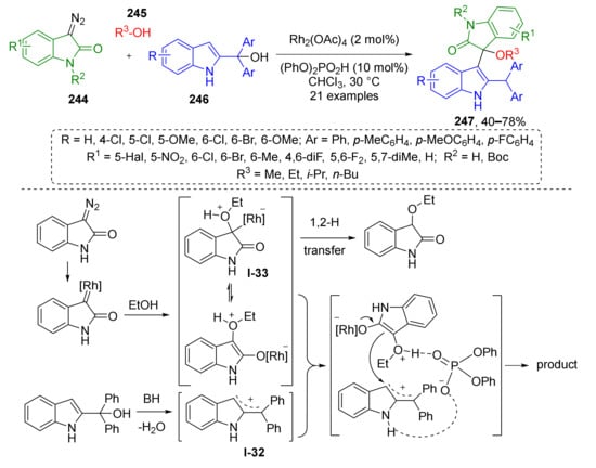 - Ma, C.; Zhou, J.Y.; Zhang, Y.Z.; Jiao, Y.; Mei, G.J.; Shi, F. Synergistic-Catalysis-Enabled Reaction of 2-Indolymethanols with Oxonium Ylides for the Construction of 3-Indolyl-3-Alkoxy Oxindole Frameworks. Chem. Asian J. 2018, 13, 2549–2558. [Google Scholar] [CrossRef]