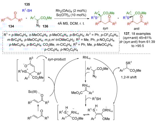 - Xiao, G.; Ma, C.; Wu, X.; Xing, D.; Hu, W. Synthesis of gamma-Sulfur-Substituted Ketones via Rh(II)/Sc(III) a Cocatalyzed Three-Component Reaction of Diazo Compounds with Thiophenols and Enones. J. Org. Chem. 2018, 83, 4786–4791. [Google Scholar] [CrossRef]