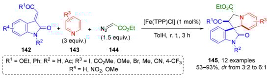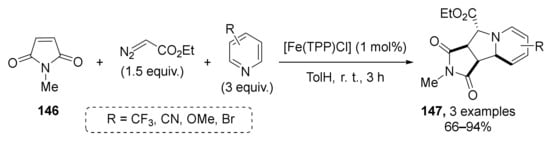 - Reddy, A.R.; Zhou, C.Y.; Che, C.M. Ruthenium porphyrin catalyzed three-component reaction of diazo compounds, nitrosoarenes, and alkynes: An efficient approach to multifunctionalized aziridines. Org. Lett. 2014, 16, 1048–1051. [Google Scholar] [CrossRef]