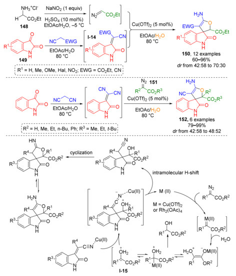 - Shi, T.; Teng, S.; Wei, Y.; Guo, X.; Hu, W. Synthesis of spiro[2,3-dihydrofuran-3,3′-oxindole] derivatives via a multi-component cascade reaction of α-diazo esters, water, isatins and malononitrile/ethyl cyanoacetate. Green Chem. 2019, 21, 4936–4940. [Google Scholar] [CrossRef]