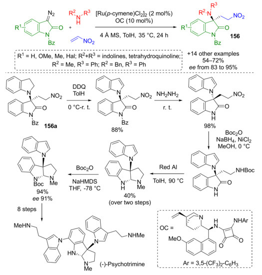 - Lian, X.L.; Meng, J.; Han, Z.Y. Ru(II)/Organo Relay Catalytic Three-Component Reaction of 3-Diazooxindoles, Amines, and Nitroalkene: Formal Synthesis of (-)-Psychotrimine. Org. Lett. 2016, 18, 4270–4273. [Google Scholar] [CrossRef]