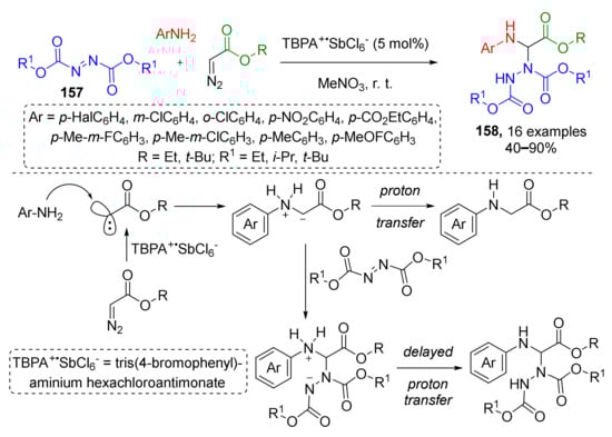 - Huo, C.; Xie, H.; Yang, C.; Dong, J.; Wang, Y. Stable radical cation salt initiated N–H insertion and related proton-transfer-delay three-component reaction. Tetrahedron Lett. 2016, 57, 2179–2182. [Google Scholar] [CrossRef]