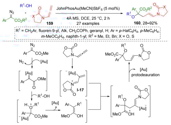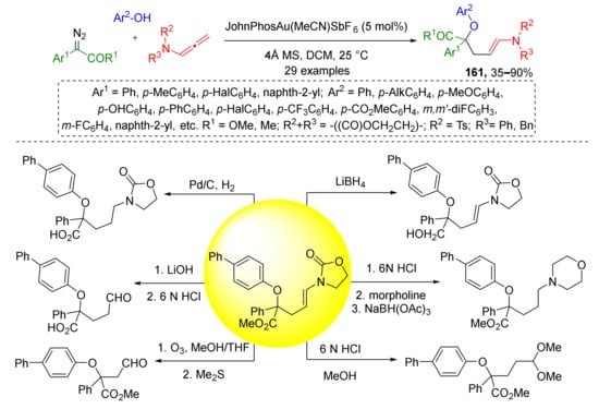 - Liu, G.; Yu, S.; Hu, W.; Qiu, H. A gold(i)-catalysed three-component reaction via trapping oxonium ylides with allenamides. Chem. Commun. 2019, 55, 12675–12678. [Google Scholar] [CrossRef] [PubMed]
