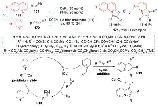 - Chen, R.; Zhao, Y.; Sun, H.; Shao, Y.; Xu, Y.; Ma, M.; Ma, L.; Wan, X. In Situ Generation of Quinolinium Ylides from Diazo Compounds: Copper-Catalyzed Synthesis of Indolizine. J. Org. Chem. 2017, 82, 9291–9304. [Google Scholar] [CrossRef] [PubMed]