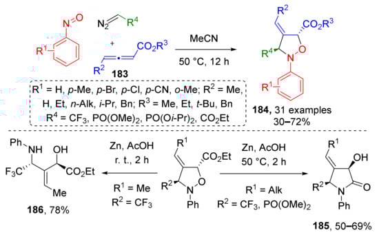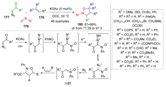 - Li, X.; Feng, T.; Li, D.; Chang, H.; Gao, W.; Wei, W. KOAc-Catalyzed One-Pot Three-Component 1,3-Dipolar Cycloaddition of alpha-Diazo Compounds, Nitrosoarenes, and Alkenes: An Approach to Functionalized Isoxazolidines. J. Org. Chem. 2019, 84, 4402–4412. [Google Scholar] [CrossRef]